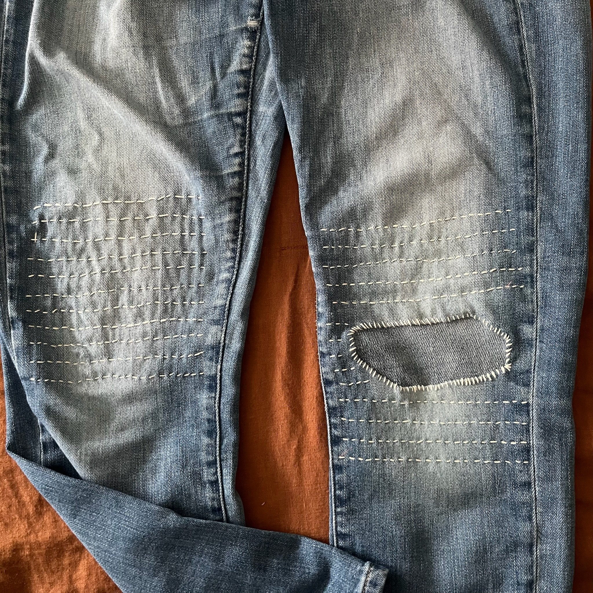 Visible mending (see image) saves money, but it is far more than just a way of reducing your monthly clothing spend. It is also a way to tap into your native creativity, reduce your carbon impact, and connect with your community.
